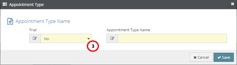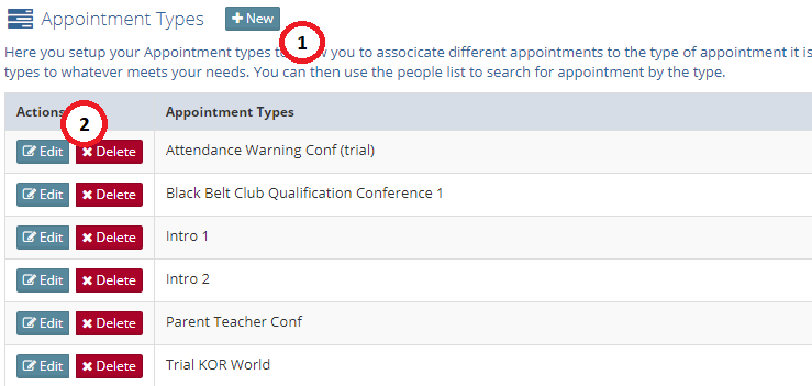 In order to create (or modify an existing) a trial appointment type head to the School Setup page. From there click on the Calendar tab and then Appointment Types. For new appointment types click on the New (see #1 in the image below) appointment button. Simply choose Yes (see #3 in the image below) in the Trial drop down then Add a name and you’re done. To modify an existing appointment type click Edit (see #2 in the image below) next to the appointment, change the Trial drop down to Yes (see #3 in the image below) and Save.