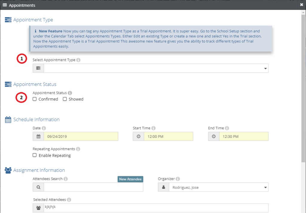 The Trial Appointment System has been simplified for ease of use. You can now mark any appointment type as a Trial Appointment. This allows simplified management and increased flexibility when planning your business systems. We have also reorganized the appointment screen to fit the new Trial Appointment System .
