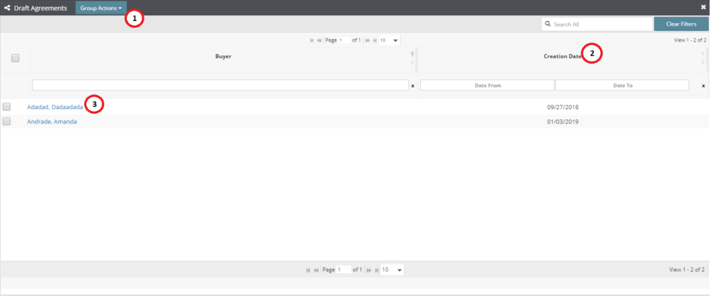 The Draft Agreement List has been converted to the same style and functionality as those in the Agreement and People List. Use the Group Actions button (see #1 in the image below) to delete selected drafts. You can now select a date range to find the exact draft agreement you need (see #2 in the image below). To continue a draft agreement simply click on the buyers name (see #3 in the image below).